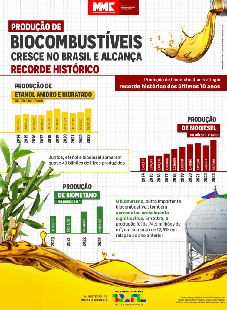 Biocombustíveis cresce no Brasil e alcança recorde histórico de produção Energia Limpa by Portal Meus Investimentos - 17 de julho de 2024 Juntos, etanol e biodiesel somaram quase 43 bilhões de litros produzidos em 2023, segundo Anuário Estatístico Brasileiro do Petróleo, Gás Natural e Biocombustíveis 2024, divulgado pela ANP Aprodução de biocombustíveis no Brasil atingiu marco histórico em 2023, refletindo o crescimento robusto no setor e a diversificação das fontes de energia renováveis no país. Juntos, etanol e biodiesel somaram quase 43 bilhões de litros produzidos, alcançando recorde histórico. Os dados estão no Anuário Estatístico Brasileiro do Petróleo, Gás Natural e Biocombustíveis 2024, divulgado pela Agência Nacional do Petróleo, Gás Natural e Biocombustíveis (ANP). “Esses resultados fortalecem a posição do Brasil como líder na produção e uso de biocombustíveis no cenário global, contribuindo significativamente para a matriz energética nacional e para a redução das emissões de gases de efeito estufa. É o Brasil na liderança da transição energética justa e inclusiva, trazendo desenvolvimento econômico e beneficiando o nosso povo”, apontou o ministro de Minas e Energia, Alexandre Silveira. Entre os destaques do estudo, está o etanol que registrou alta de 15,5%, totalizando 35,4 bilhões de litros produzidos. A produção de etanol anidro, que é misturado à gasolina nos postos, aumentou 13,5% em relação ao ano passado, enquanto a de etanol hidratado, vendido separadamente na bomba, cresceu 16,8% no mesmo período. A região Sudeste liderou a produção nacional de etanol, com um volume de 17,2 bilhões de litros, respondendo por 48,5% da produção brasileira. Outros aumentos significativos foram observados nas regiões Nordeste, Sul, e Centro-Oeste. Na área do biodiesel, a produção nacional foi de mais de 7,5 bilhões de litros, impulsionada pela elevação do percentual de mistura obrigatória ao diesel para 12%, a partir de 1º de abril de 2023. A região Sul destacou-se como a maior produtora, com 3,1 bilhões de litros, seguida pela região Centro-Oeste, com 3 bilhões. O biometano, outro importante biocombustível, também apresentou crescimento significativo. Em 2023, a produção foi de 74,9 milhões de m³, um aumento de 12,3% em relação ao ano anterior. Assessoria Especial de Comunicação Social – MME Fonte: Assessoria Especial de Comunicação Social – MME O post Biocombustíveis cresce no Brasil e alcança recorde histórico de produção apareceu primeiro em Portal Energia Limpa. Compartilhe isso: Clique para compartilhar no Facebook(abre em nova janela) Facebook Clique para compartilhar no X(abre em nova janela) 18+ Clique para compartilhar no WhatsApp(abre em nova janela) WhatsApp Clique para compartilhar no Telegram(abre em nova janela) Telegram Mais Clique para compartilhar no LinkedIn(abre em nova janela) LinkedIn Clique para compartilhar no Tumblr(abre em nova janela) Tumblr Clique para imprimir(abre em nova janela) Imprimir Relacionado